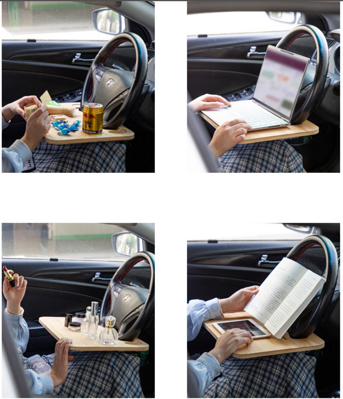 - Bàn được sử dụng bằng cách móc 2 đầu khuyết của bàn vào vô lăng xe hơi, vô lăng sẽ giúp giữ bàn cân bằng và tạo điểm tựa để laptop hay ipad làm việc, đọc sách.